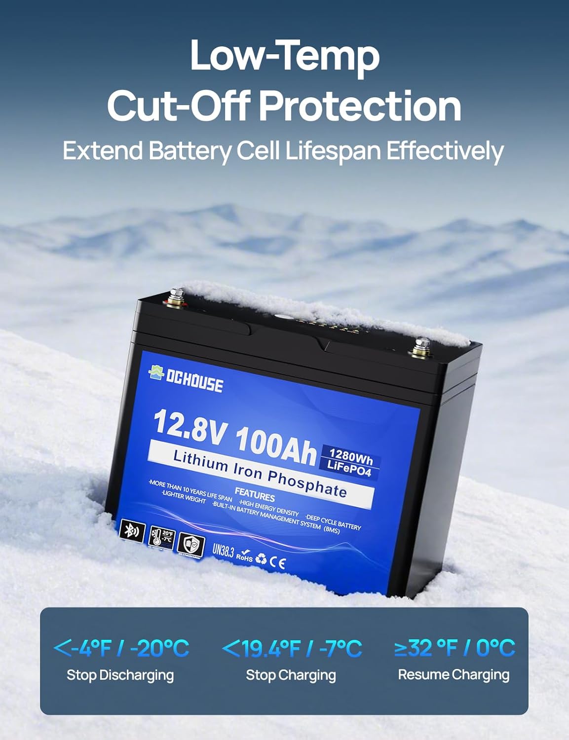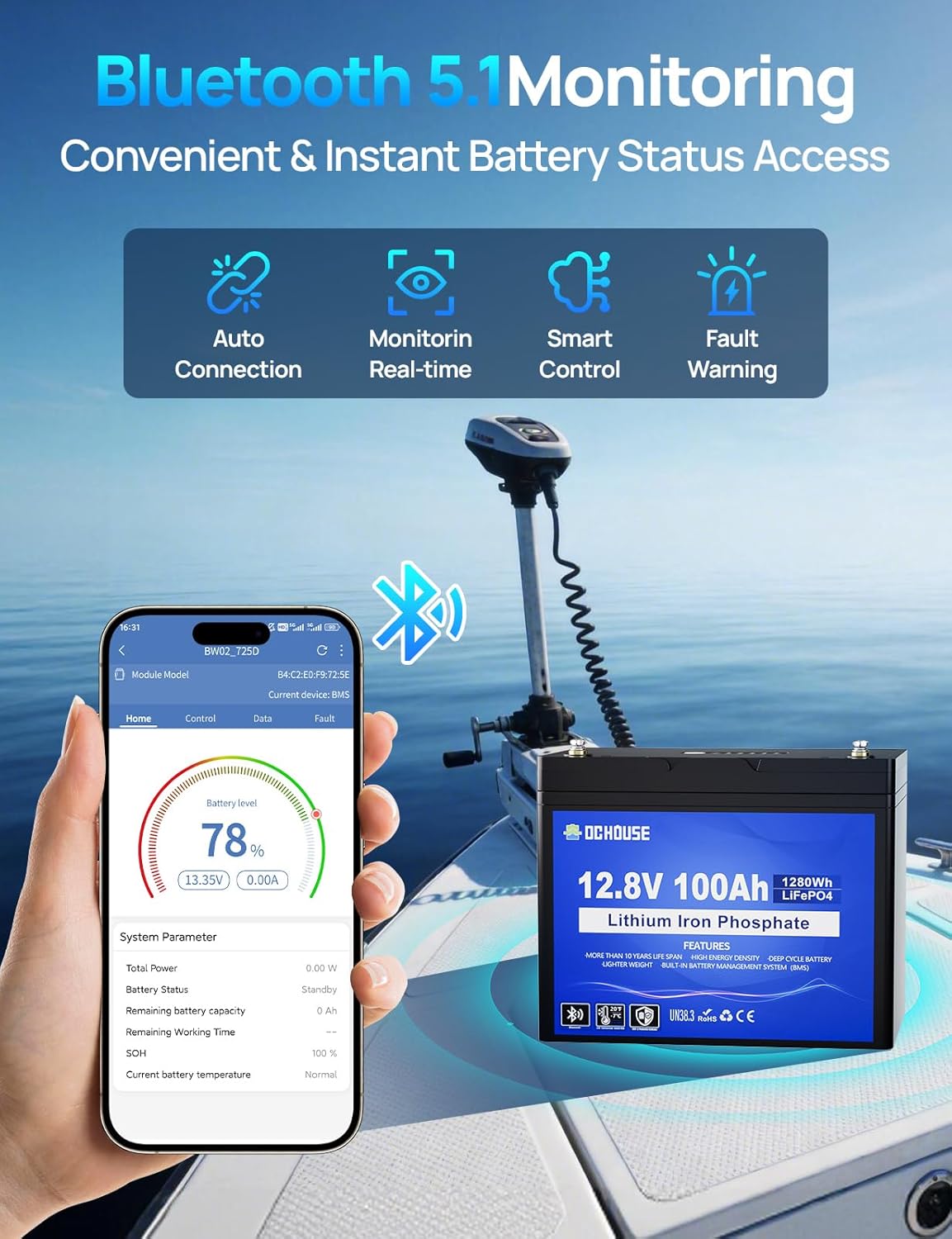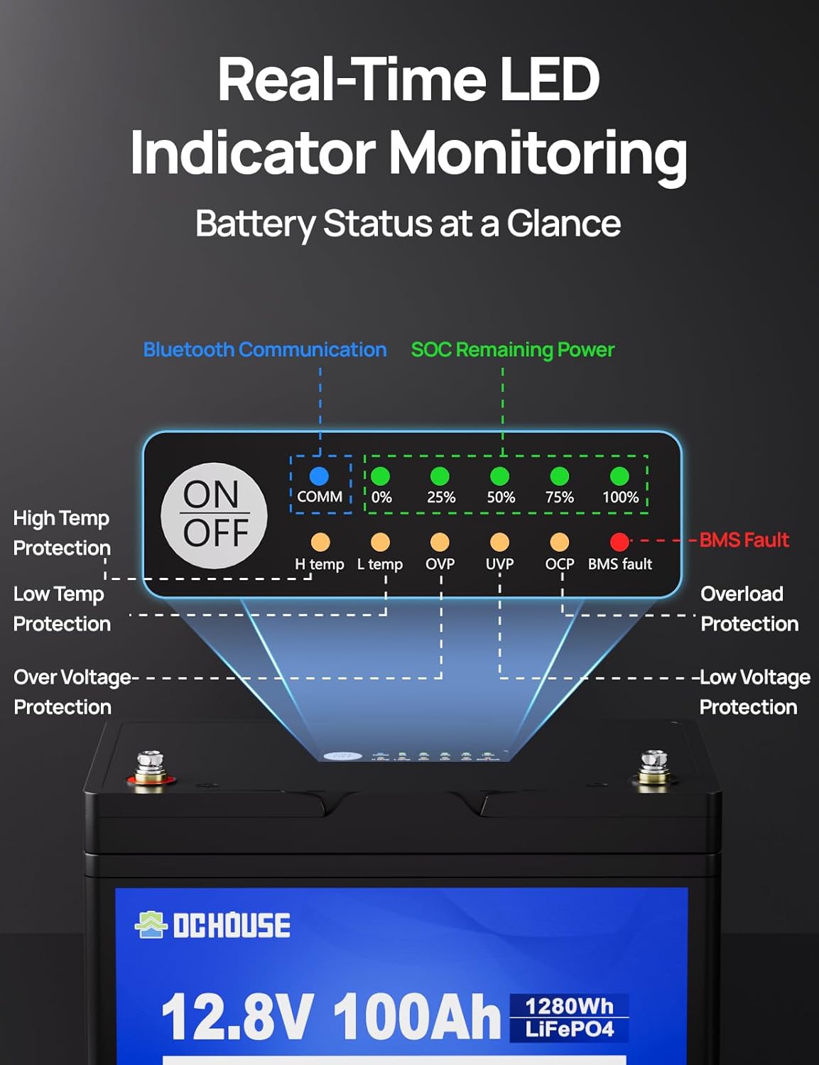 Bluetooth APP Monitoring: DC HOUSE 12V100AH battery has built-in Bluetooth, which can connect with DC HOUSE APP (Blue